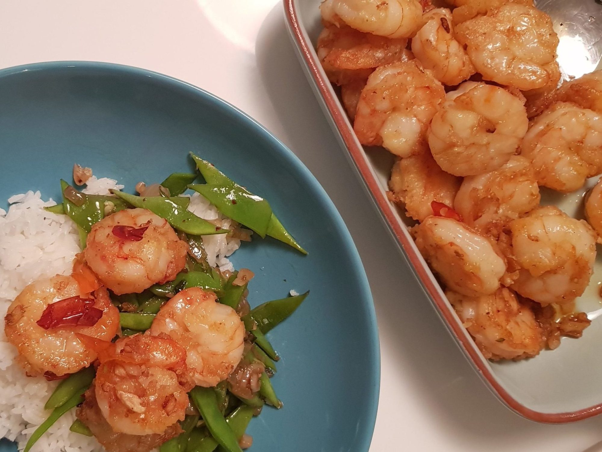 Fruit nu de knoflook, gember en pepers op middelmatig vuur. Voeg vervolgens de gebakken gamba’s toe en roerbak het geheel 3-5 minuten.
