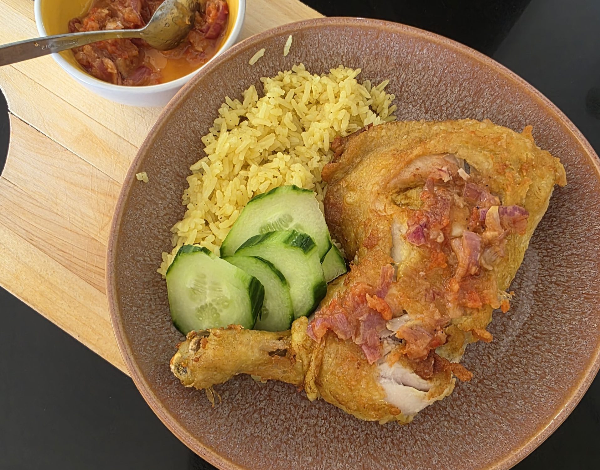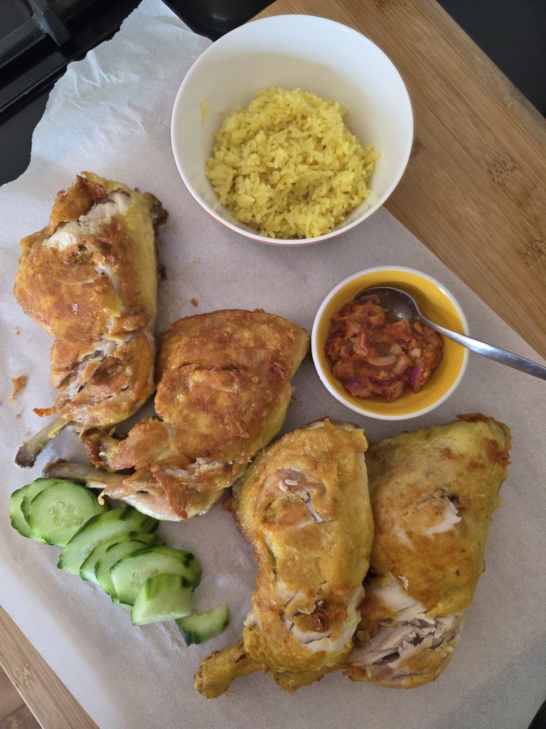 - Voed de kippebouten in een pan met water, voeg de uien, knoflook, laos, salambladeren, pimentkorrels, witte peper, bouillonblokjes en kurkumapoeder toe.