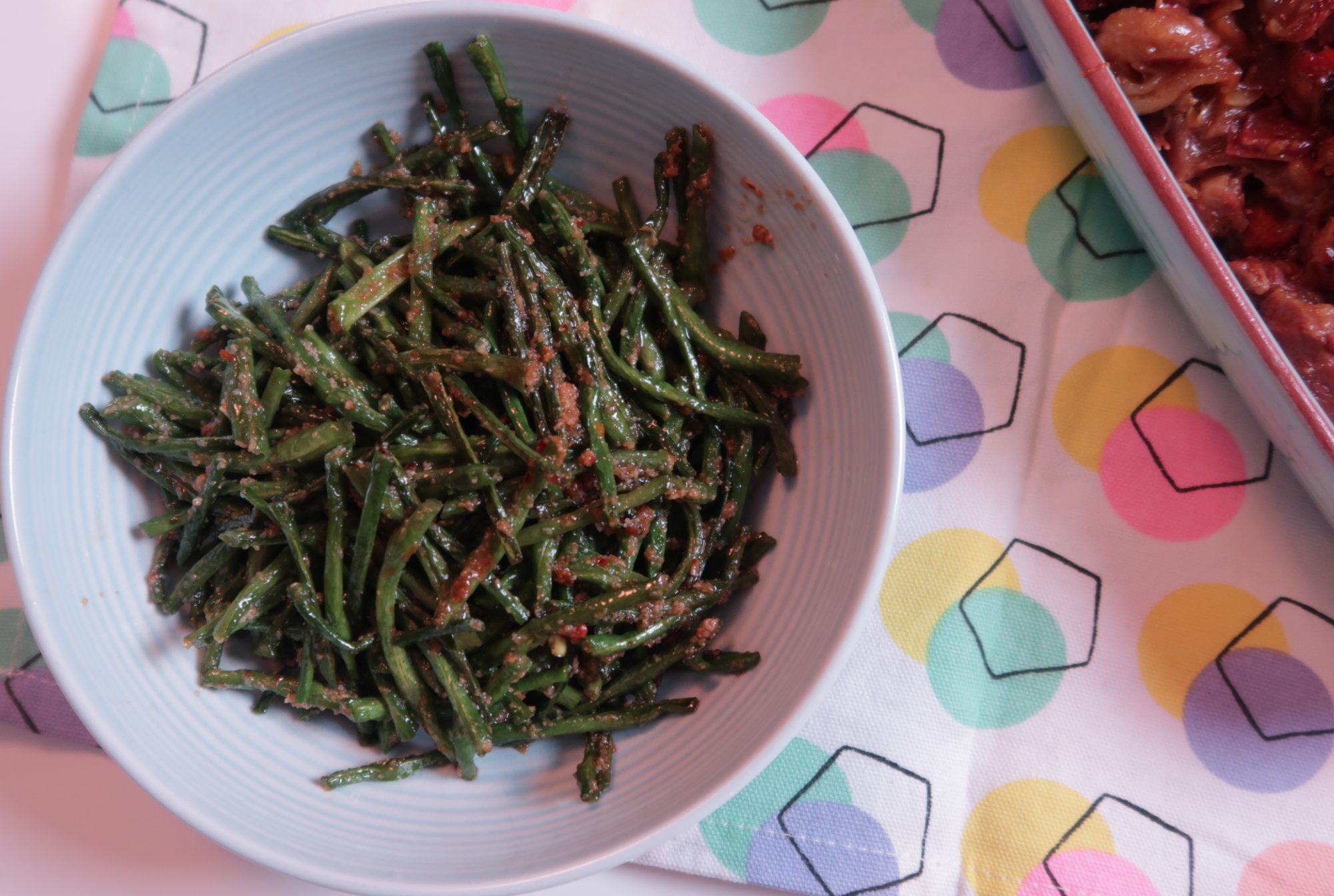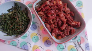 Verhit olie in een wok. Voeg nu de gedroogde knoflook poeder en fruit krap 1 minuut. Vervolgens voeg je de kouseband en schep goed om.