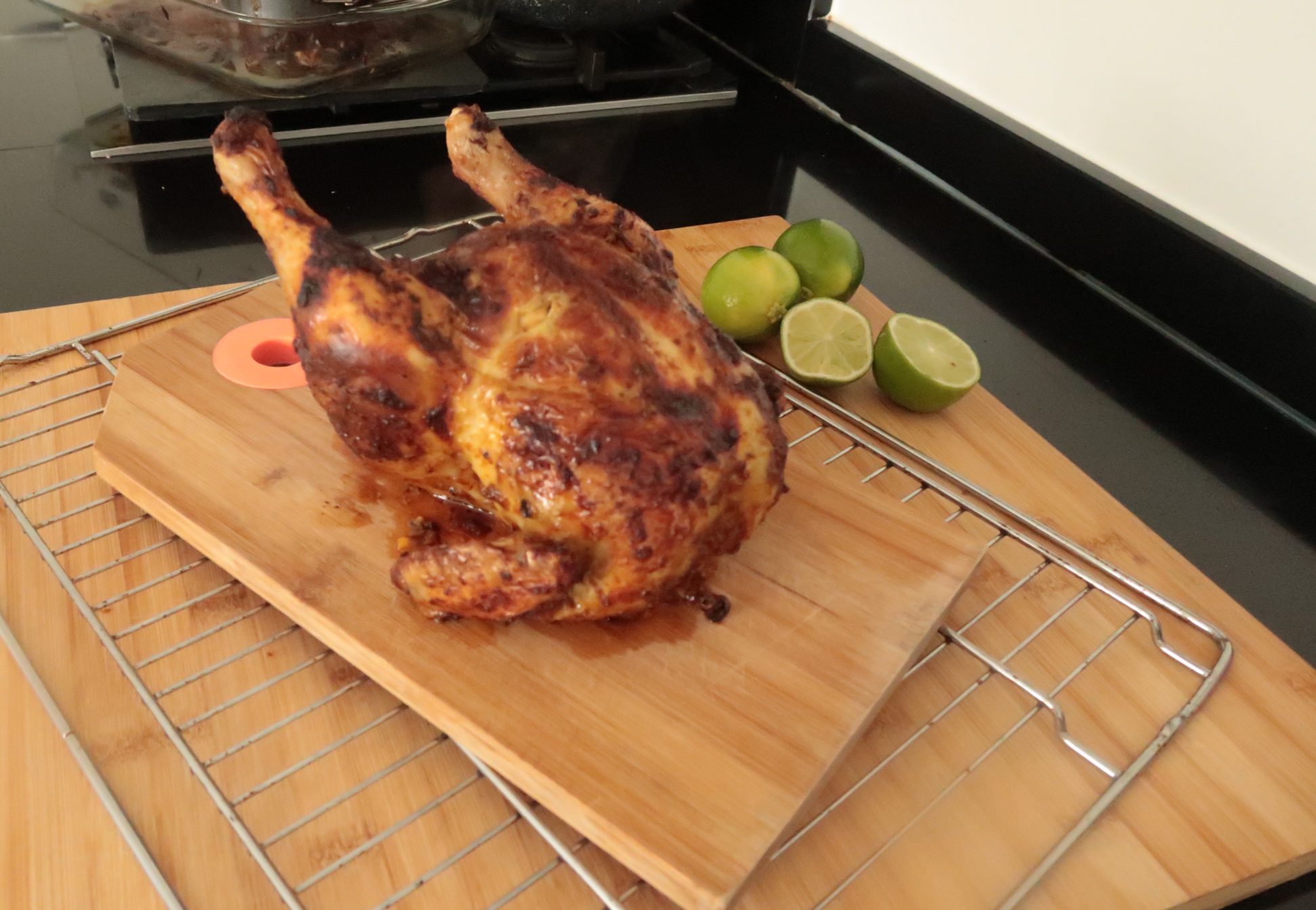 Verwarm de oven op 220 graden op grillstand. Zet de kip nu in de oven. Haal de kip na 45 minuten uit de oven. Smeer nog eens met het overgebleven marinade aan beide kanten. Grill nog eens 45 minuten. Na in totaal 90 minuten is het vlees gaar.